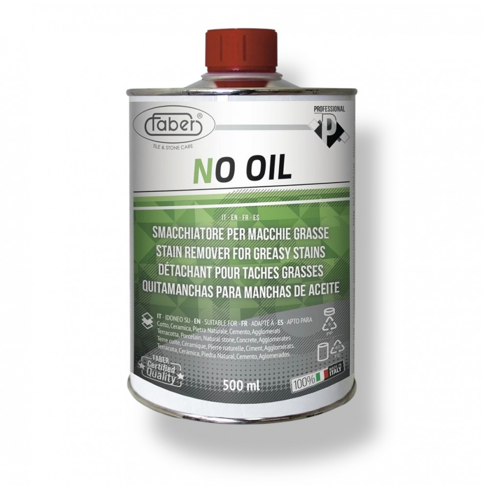 NO OIL di Faber è uno smacchiatore professionale a base solvente, formulato per rimuovere efficacemente macchie di natura grassa e oleosa. È ideale per uso domestico e professionale su una vasta gamma di materiali, compresi quelli delicati come marmi lucidi e superfici sensibili agli acidi.