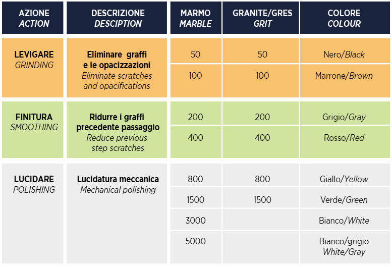 Per incrementare il colore del materiale si consiglia, dopo il passaggio con i dischi, di utilizzare un prodotto di lucidatura chimica, quali Cristallizzanti o Polveri lucidanti. CLICCA QUI PER LE POLVERI LUCIDANTI