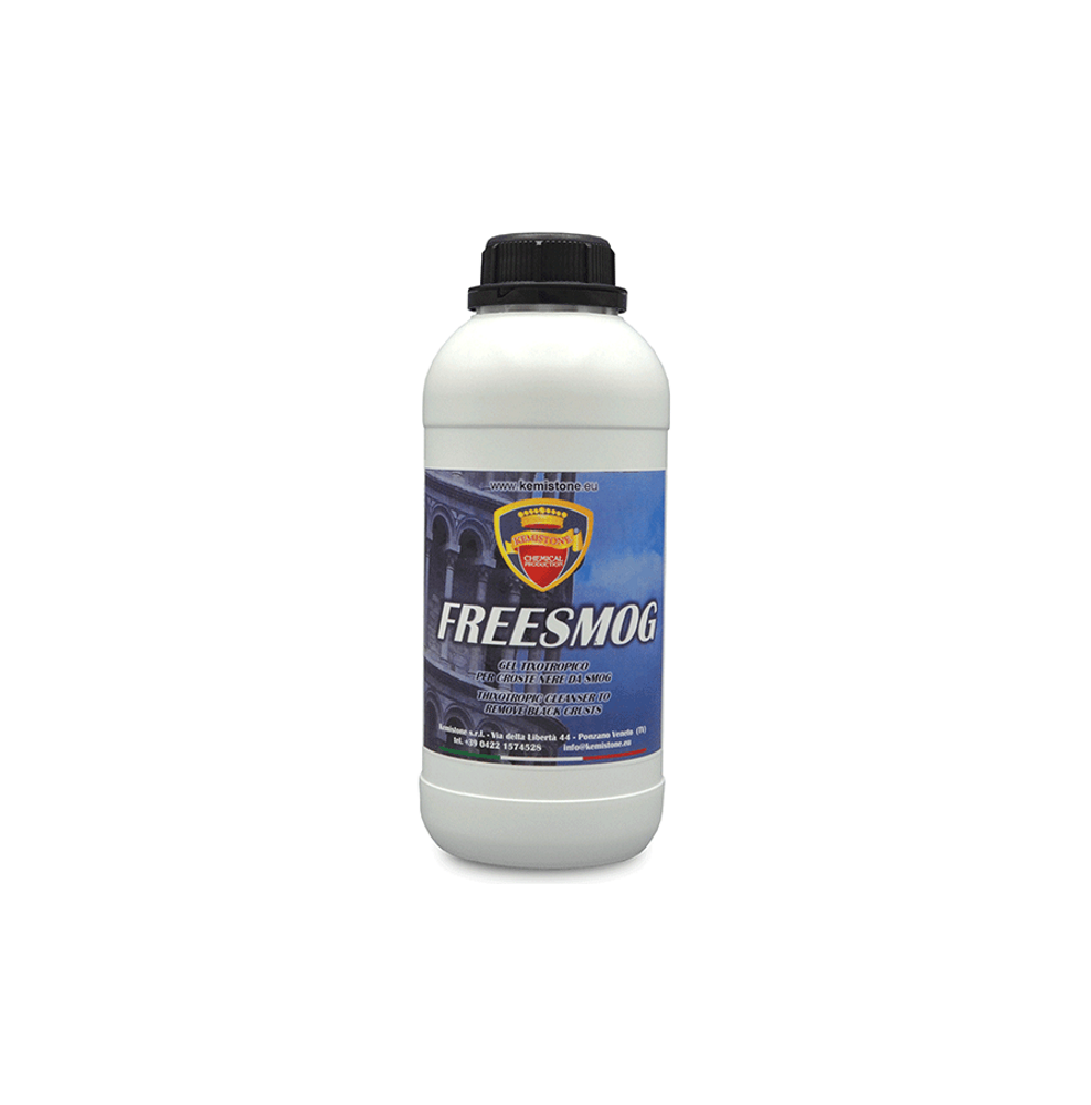 FREESMOG è un detergente di consistenza gelatinosa approntato per poter effettuare una efficace pulizia di facciate esterne in marmo, granito, beola, arenarie, pietre vulcaniche, pietre laviche, limestone, in mattoni, cemento, agglomerati di cemento e graniglia. Il prodotto permette una facile ed efficace pulizia di sporco causato da smog, residui carboniosi, sporco atmosferico, ecc.