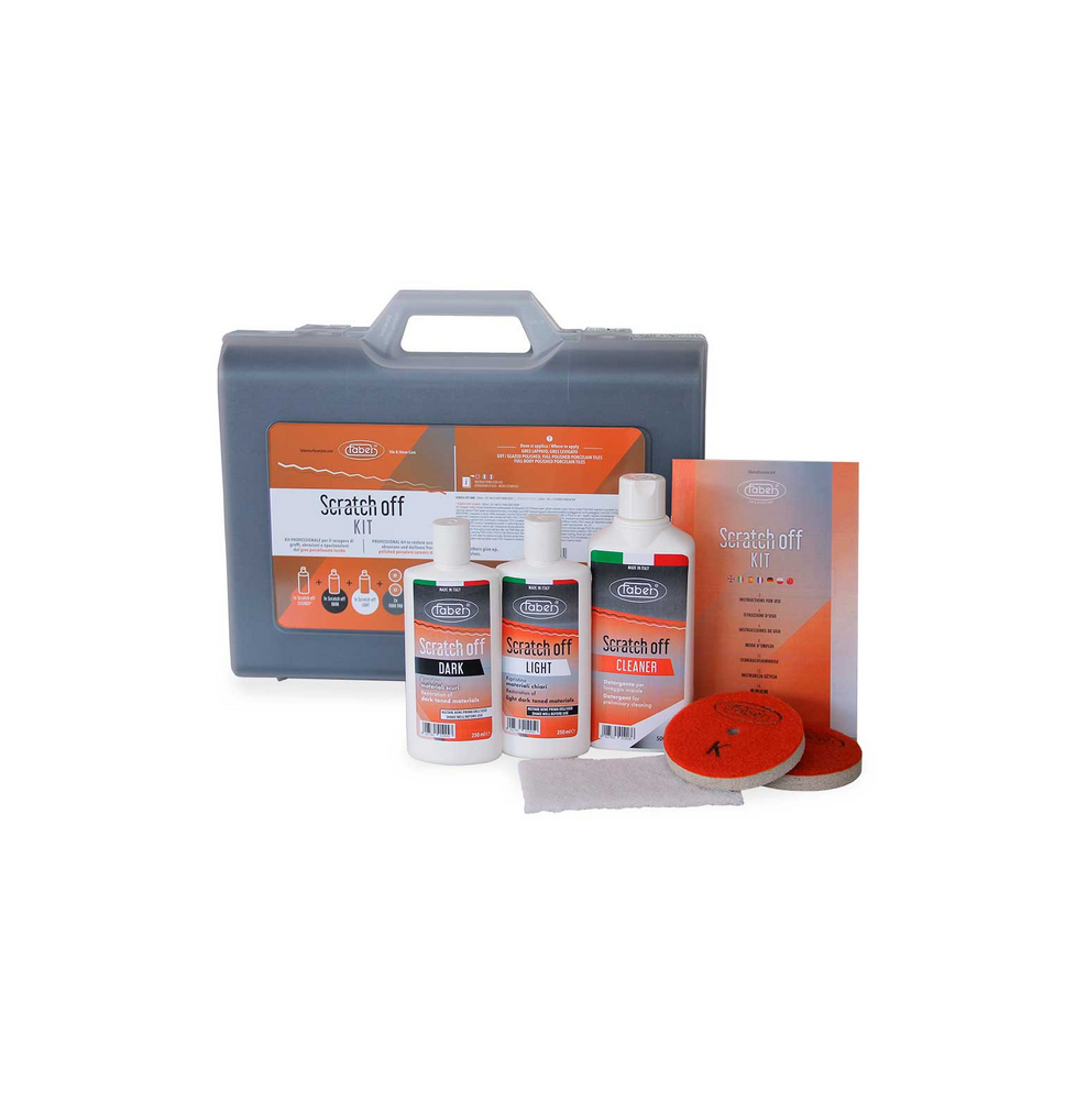 SCRATCH OFF KIT Faber consente di ripristinare graffi ed abrasioni sul gres porcellanato lucido in maniera rapida, semplice e pulita.